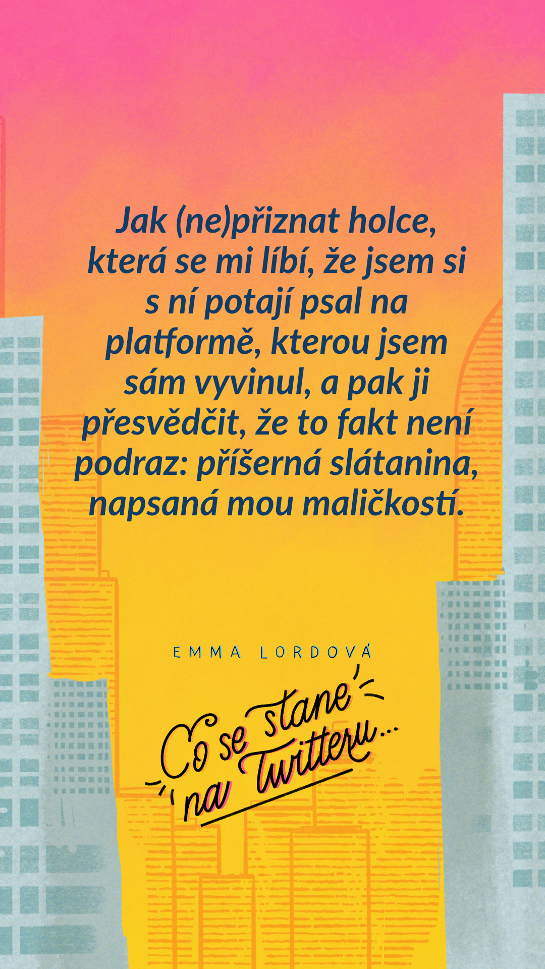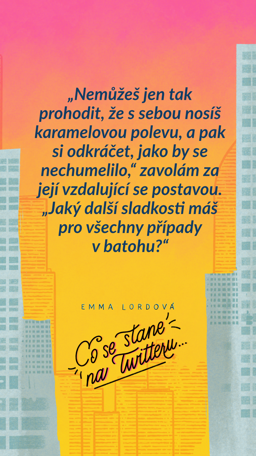 „Nemůžeš jen tak prohodit, že s sebou nosíš karamelovou polevu, a pak si odkráčet, jako by se nechumelilo,“ zavolám za její vzdalující se postavou. „Jaký další sladkosti máš pro všechny případy v batohu?“