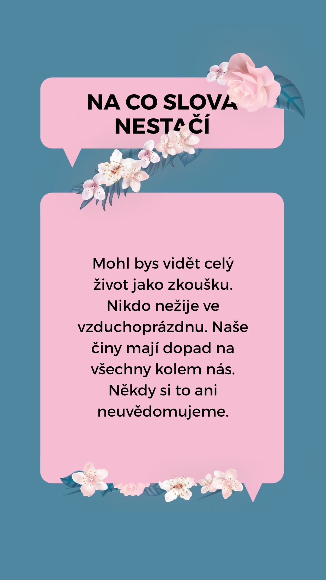 Mohl bys vidět celý život jako zkoušku. Nikdo nežije ve vzduchoprázdnu. Naše činy mají dopad na všechny kolem nás. Někdy si to ani neuvědomujeme.
