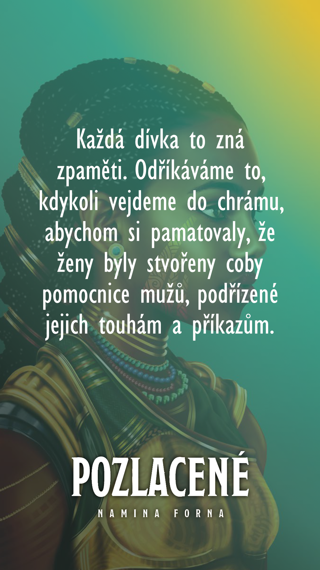 Každá dívka to zná zpaměti. Odříkáváme to, kdykoli vejdeme do chrámu, abychom si pamatovaly, že ženy byly stvořeny coby pomocnice mužů, podřízené jejich touhám a příkazům.