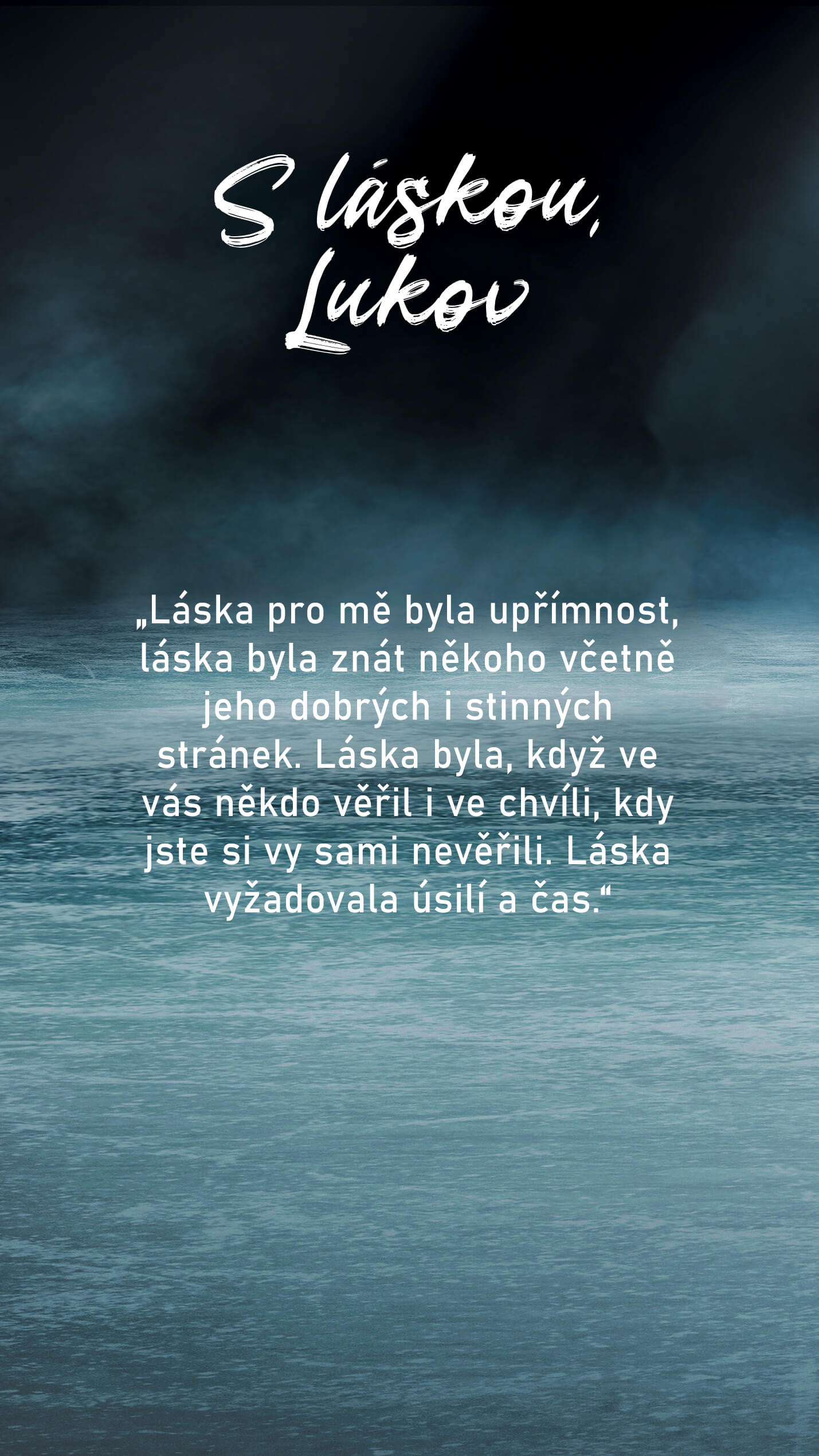 Láska pro mě byla upřímnost, láska byla znát někoho včetně jeho dobrých i stinných stránek. Láska byla, když ve vás někdo věřil i ve chvíli, kdy jste si vy sami nevěřili. Láska vyžadovala úsilí a čas.