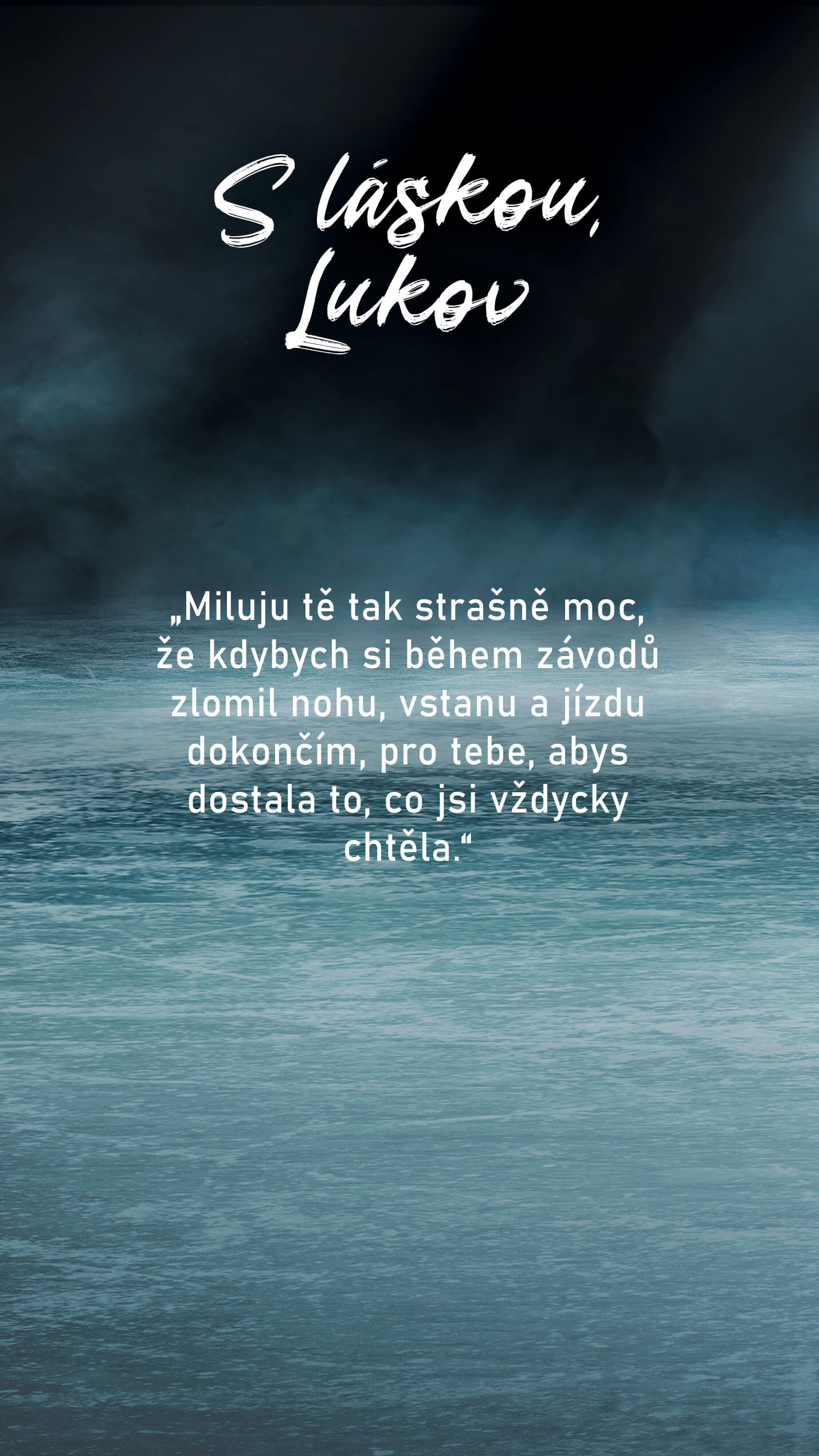 Miluju tě tak strašně moc, že kdybych si během závodů zlomil nohu, vstanu a jízdu dokončím, pro tebe, abys dostala to, co jsi vždycky chtěla.